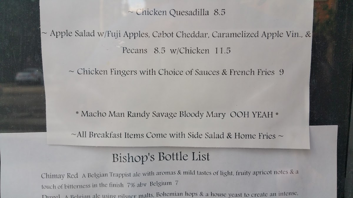 “ I was in the area and surprised to see Bishop still open. It's been over 20 years since I was last in. I had a pils from Vermont that was so tasty, turkey chilli, and a flank steak sandwich. Nice chill spot that we spent a few hours before heading away. ”